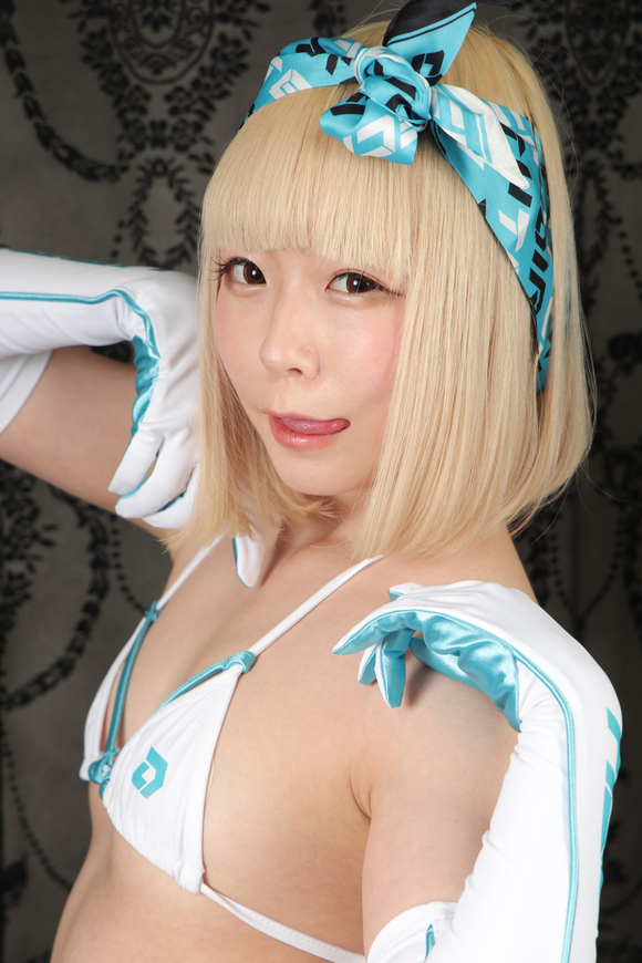 光沢のあるロンググローブとストッキングに包まれ、極小ビキニがてんりちゃんの美しいボディラインを際立たせます。腰元を大胆に彩るボトムのデザインは、露出度MAXで目が離せない!